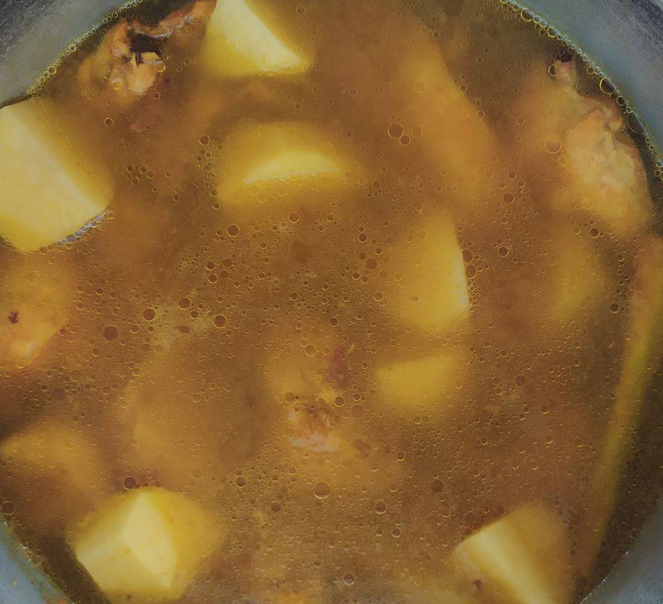 - Tambahkan kiub stok dagingdan ubi kentang. Biarkan sehingga masak.