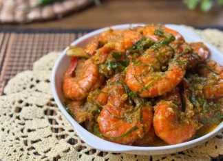 Bila mendidih, masukkan udang, masak 2 – 3 minit dan tuang pati santan.
